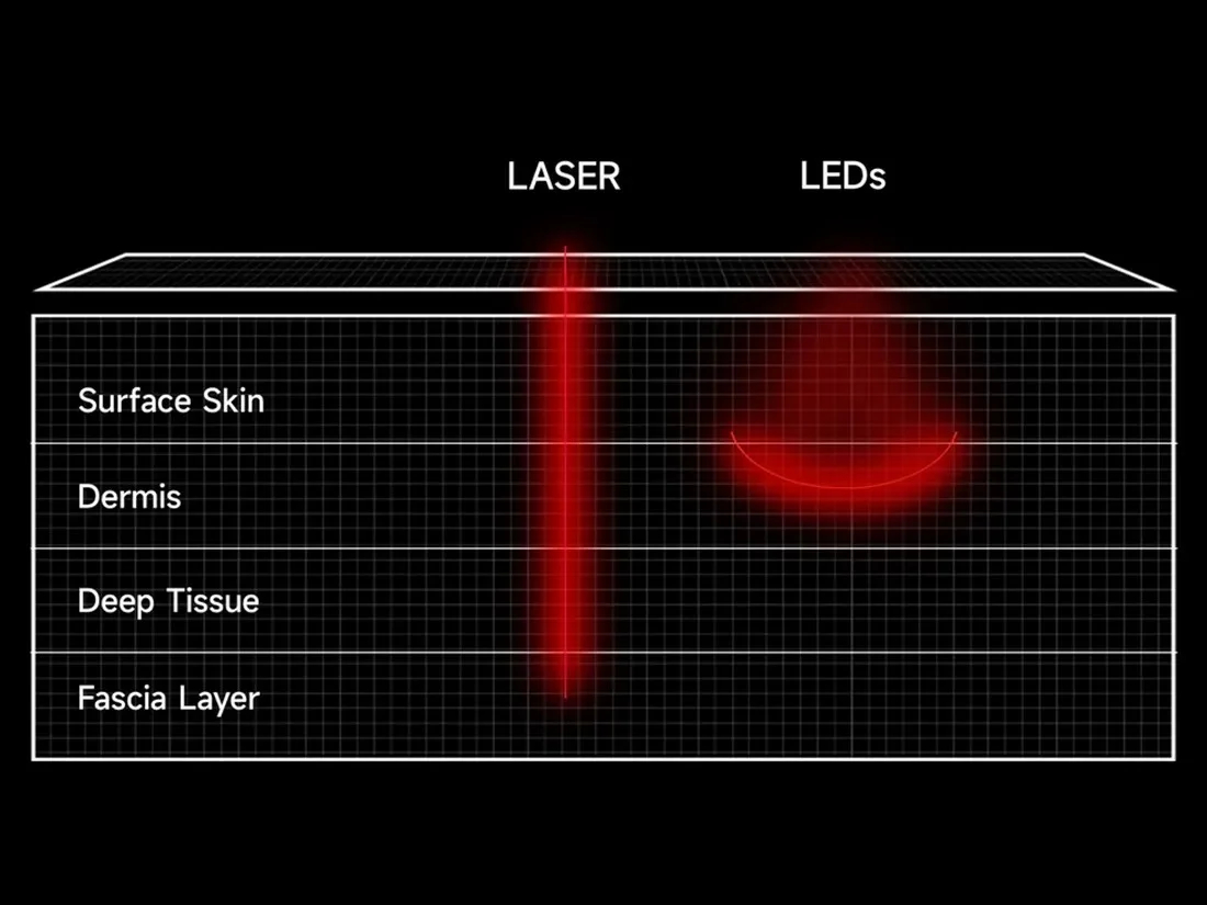 A differenza dei comuni LED, i laser VCSEL emettono luce con un angolo ultra-stretto di 20°, garantendo un’energia concentrata e una penetrazione nei tessuti molto più profonda.